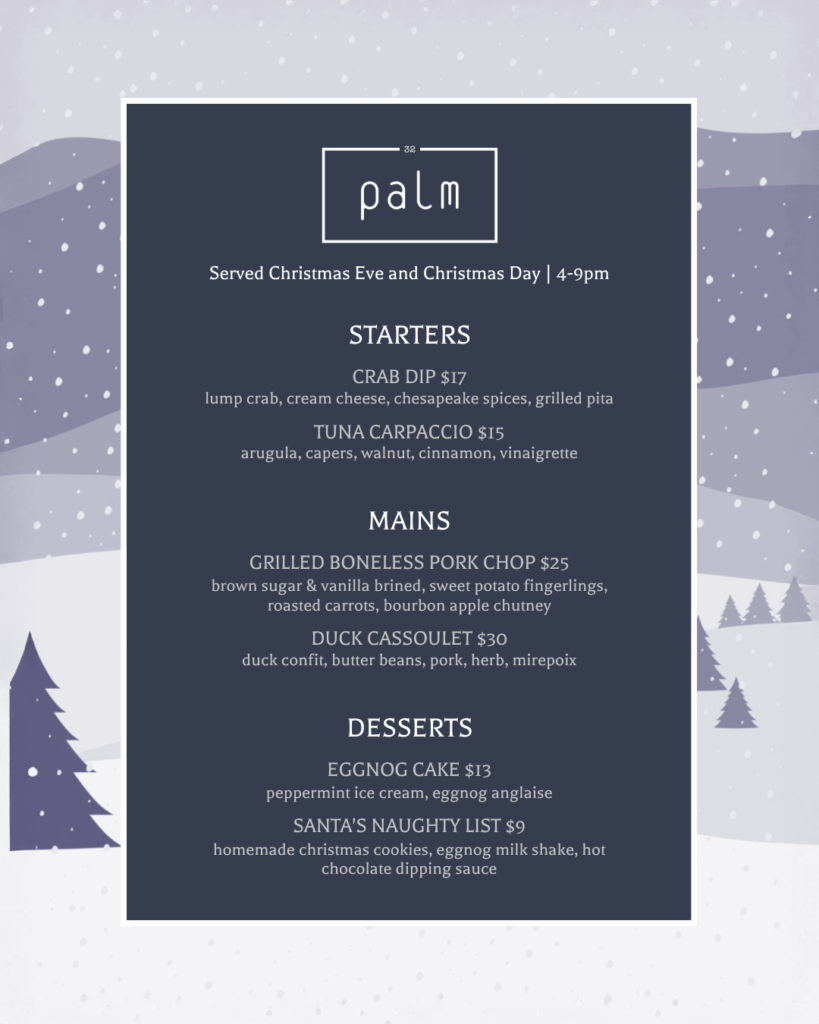 32 Palm serves up a festive holiday menu that’s both playful and indulgent, perfect for celebrating Christmas in style. Start with shareable appetizers like crab dip or delicate tuna carpaccio, then move on to hearty mains such as a grilled boneless pork chop or rich duck cassoulet. End the meal on a sweet note with seasonal desserts like eggnog cake or Santa’s Naughty List — a fun twist on homemade Christmas cookies served with an eggnog milkshake and hot chocolate dipping sauce. It’s a holiday dining experience that’s sure to delight every palate.