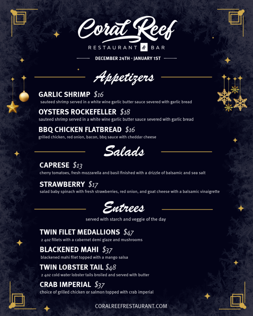 Coral Reef is celebrating the season with a special holiday menu, available December 24th through January 1st, perfect for a festive getaway. Kick off your meal with flavorful appetizers like garlic shrimp, Oysters Rockefeller, or BBQ chicken flatbread. For the main course, indulge in twin filet medallions, blackened mahi, twin lobster tails, or classic crab imperial. It’s a holiday dining experience designed to make your Christmas week in Ocean City truly memorable.