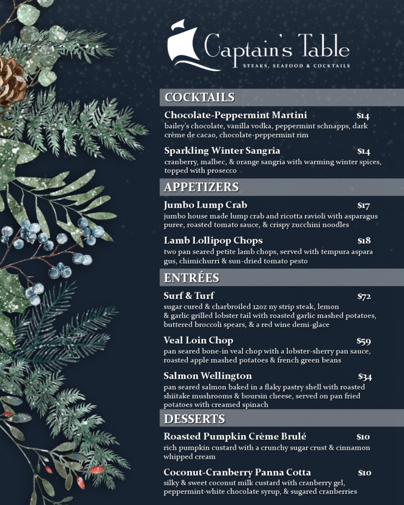 Captain’s Table brings elevated holiday dining with a festive menu that feels both cozy and indulgent. Start the celebration with seasonal cocktails like a rich Chocolate Peppermint Martini or refreshing Sparkling Winter Sangria, then enjoy appetizers such as Jumbo Lump Crab Ravioli or savory Lamb Lollipop Chops. For the main event, holiday favorites shine with refined flair — including classic Surf & Turf, tender Veal Loin Chop, and a beautifully prepared Salmon Wellington. It’s a perfect choice for a Christmas dinner that feels special and celebratory.