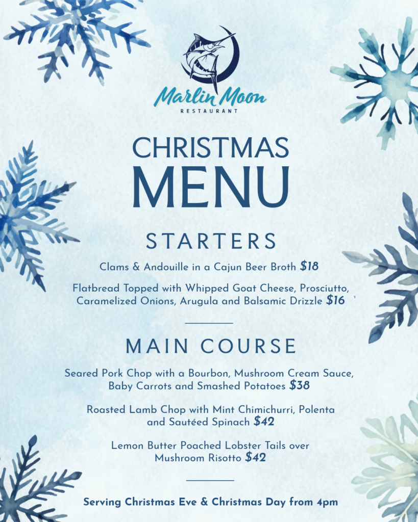 Marlin Moon offers a festive dining experience with bold flavors and elevated comfort dishes perfect for the holiday season. Start with warming starters like clams and andouille in a Cajun beer broth or a shareable flatbread topped with whipped goat cheese, prosciutto, caramelized onions, arugula, and a balsamic drizzle. For the main course, choose from a perfectly seared pork chop with bourbon mushroom cream sauce, baby carrots, and smashed potatoes, a roasted lamb chop with mint chimichurri, polenta, and sautéed spinach, or indulge in lemon butter–poached lobster tails served over mushroom risotto. It’s a standout choice for a Christmas dinner that feels both festive and refined.