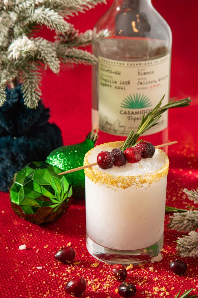 The White Christmas Margarita is a festive, winter-white spin on a classic margarita, blending Casamigos tequila and Cointreau with creamy coconut milk, coconut water, and fresh lime juice. It is then finished with a gold and white sugar-rimmed glass and garnished with sugar-dusted rosemary and cranberries. This cocktail balances bright citrus, smooth coconut, and seasonal elegance. It’s as beautiful on the bar as it is refreshing to sip!